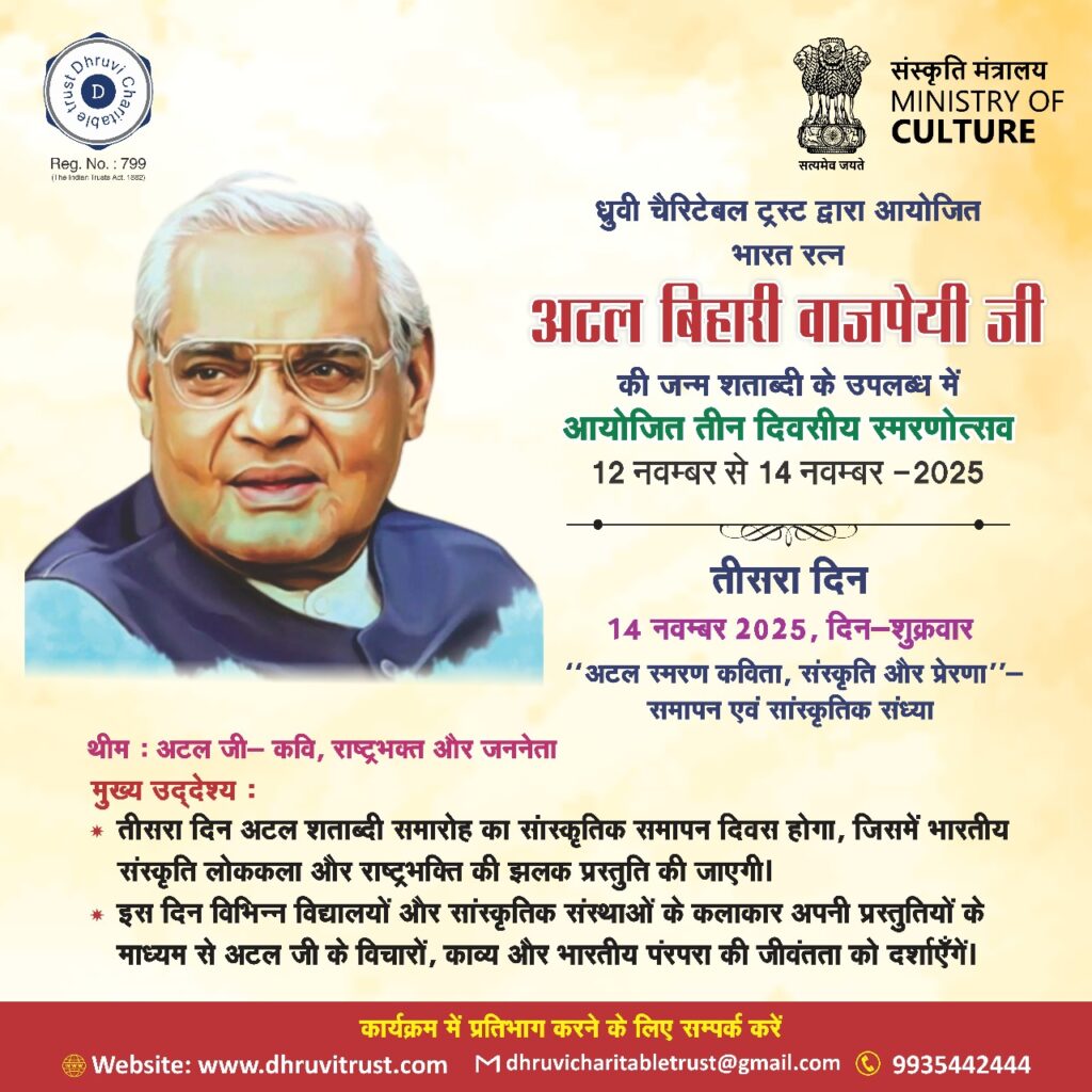 The third day marks the grand cultural conclusion of the Atal Centenary Celebration, highlighting Indian culture, folk arts, and patriotism.